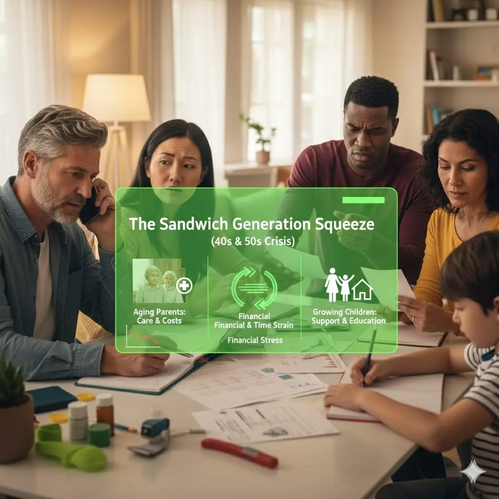 The sandwich generation faces complex stress challenges due to rising healthcare, education costs, limited savings, and delayed retirement.